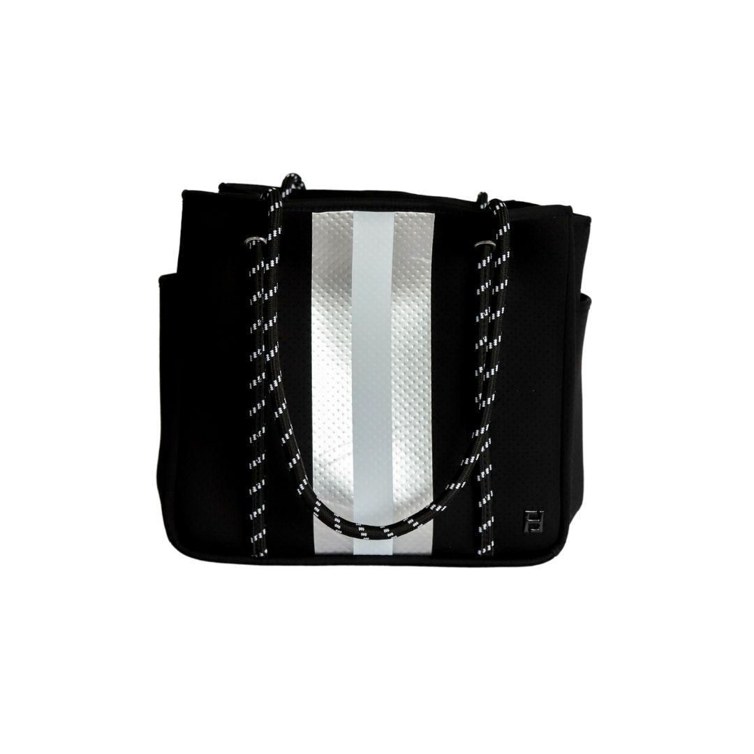 Courtside Small Tote for Tennis, Pickleball and Paddle | Black with Silver and White Stripes