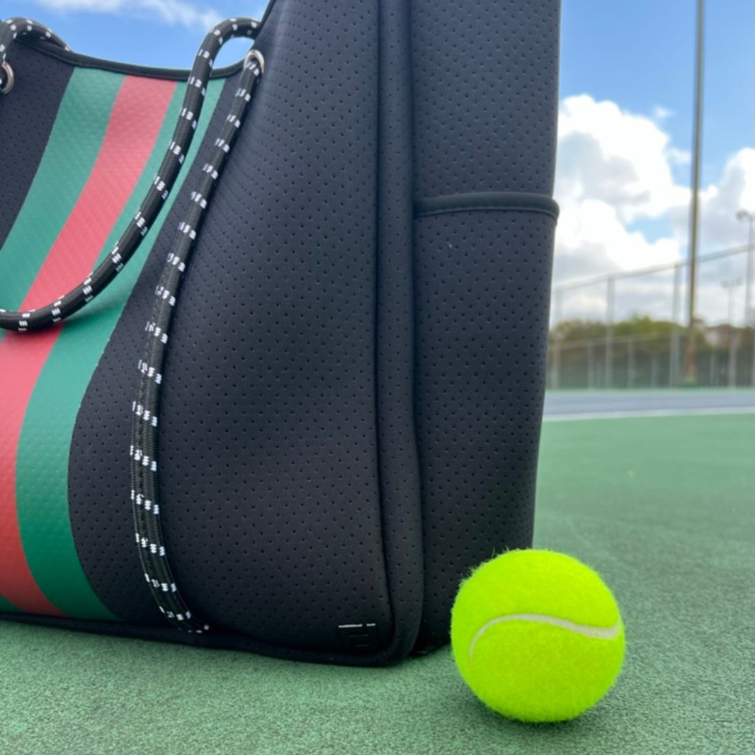 The Courtside luxury tennis tote is crafted from high-quality materials and built to last for years of fun and play. The black neoprene exterior is durable and water-resistant ensuring your belongings stay safe and dry. The limited-edition red and green stripes add a pop of color and personality to the classic black design, making it a year-round stand out.