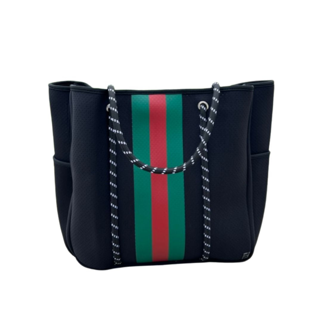 Discover the newest addition to your preppy accessory collection - the Large Courtside Black Tennis Tote with Red and Green Stripes by Five Love. Whether you're on the tennis court or headed to the office, this designer tennis tote is the perfect mix of style and functionality.